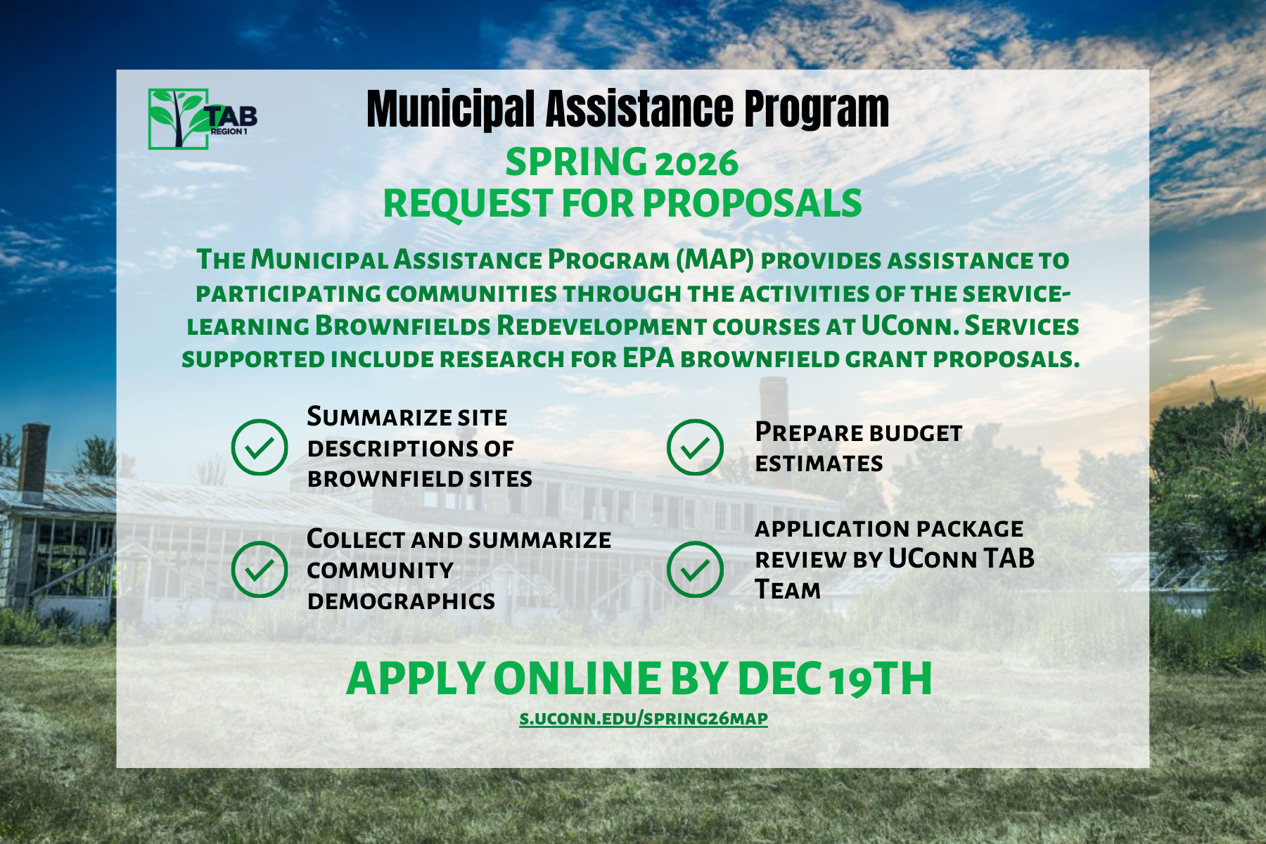The proposals will be supported through the University of Connecticut Spring 2026 UConn Brownfield Redevelopment course. If you have any questions before applying, please reach out to us at uconn-tab@uconn.edu