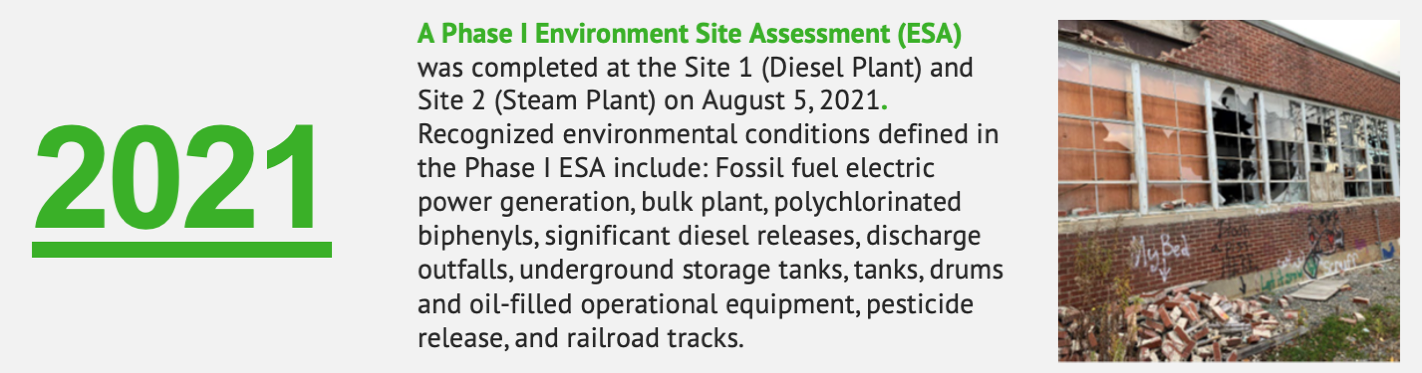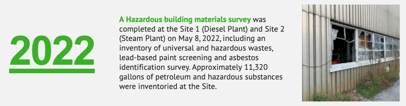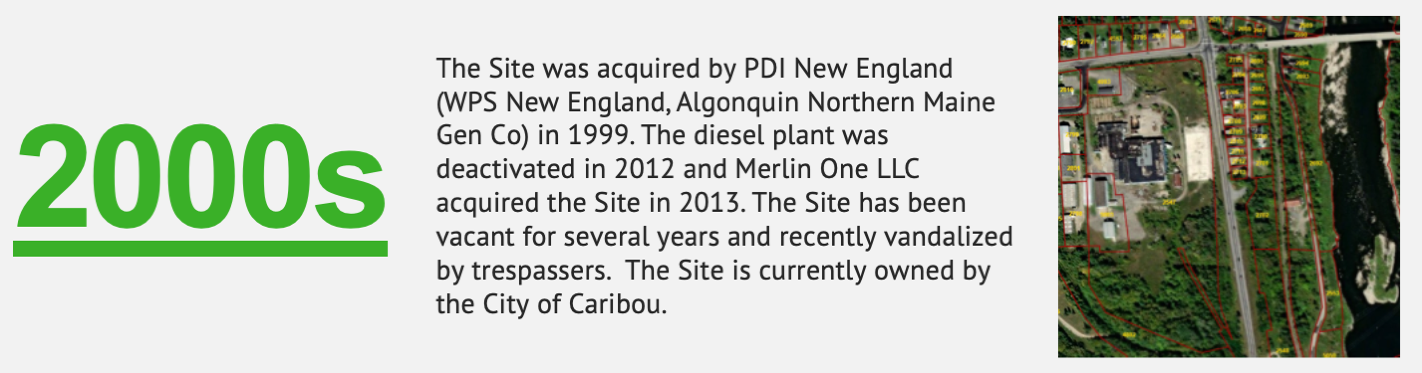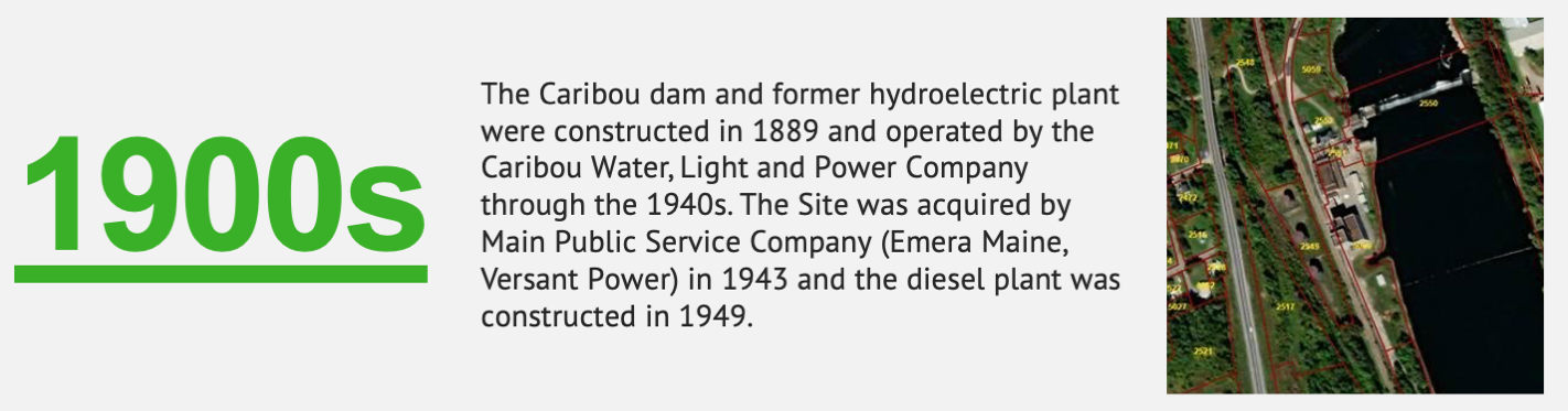 Across the land of 8 acres, the Caribou dam and former hydroelectric plant were constructed in 1889 and operated by the Caribou Water, Light and Power Company through the 1940s. The Site was acquired by Maine Public Service Company (Emera Maine, Versant Power) in 1943 and the existing Diesel plant was constructed in 1949 and deactivated in 2011. It is currently owned by the City of Caribou and the Site has been vacant for several years and the buildings are in poor repair.